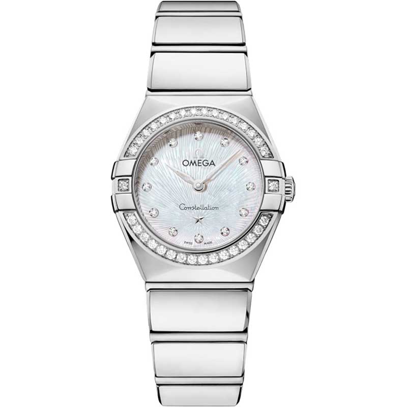 Omega Constellation Manhattan Quartz Diamond Mother of Pearl Dial Watch 131.15.25.60.55.002. Stainless steel case with a stainless steel bracelet. Fixed stainless steel bezel set with diamonds. Mother of Pearl dial with luminous silver-tone hands and diamond hour markers. Omega 4061 quartz movement. Scratch resistant sapphire crystal. Pull / push crown. Solid case back. Round case shape. Case size: 25 mm. Band width: 15.9 mm. Fold over clasp with a safety release. Water resistant at 30 meters / 100 feet.