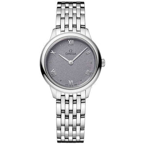 Omega 434.10.28.60.03.001 De Ville Prestige Quartz 27.5mm Ladies Watch. This striking watch features a polished stainless steel case that offers both durability and elegance. The captivating lavender dial showcases a fine sunray finish, creating a beautiful play of light and depth. Polished hands and applied hour markers enhance the watch's sophisticated appearance while ensuring excellent readability. Powered by the Omega quartz caliber 4601, this battery-powered timepiece guarantees reliable performance, making it an ideal accessory for any occasion, whether casual or formal.