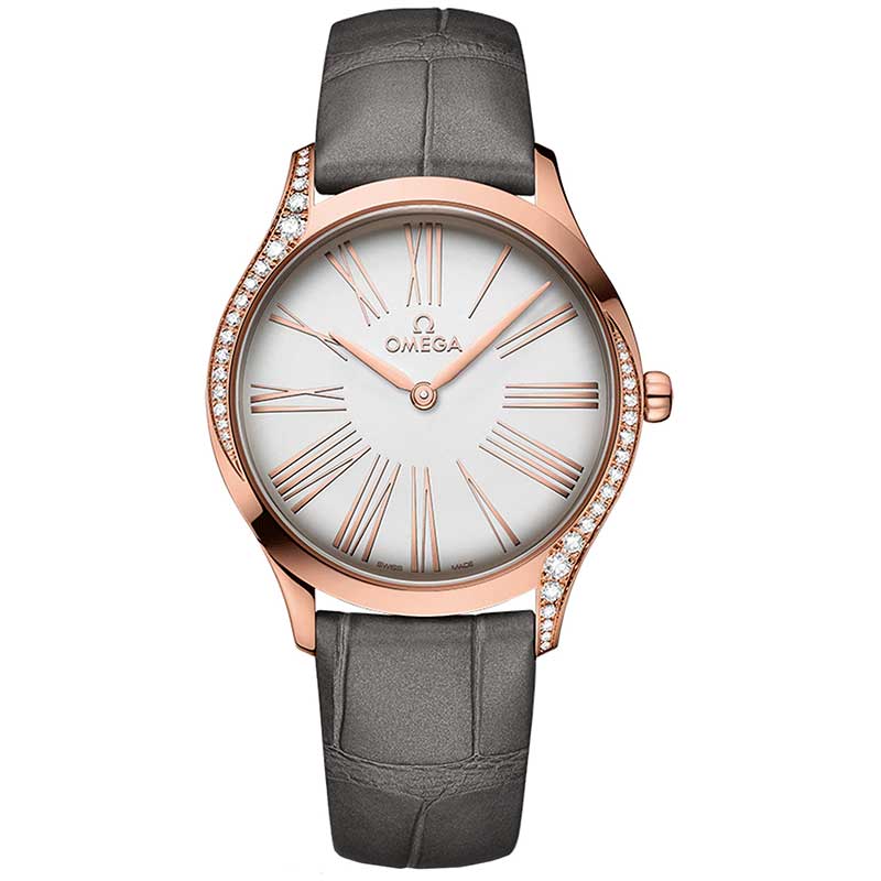 Omega De Ville Tresor Quartz 36mm Ladies Watch 428.58.36.60.02.001. This exquisite timepiece features a polished 18kt Sedna Rose gold case adorned with two curving rows of diamonds, while the crown is crafted from polished red HyCeram and set with a single diamond. The watch boasts a silver dial with striking 18kt rose gold Roman numeral hour markers, and its mirrored case back showcases a unique 'Time For Her' engraved pattern. It is powered by the Omega battery-powered caliber 4061, combining elegance and functionality in one stunning design.