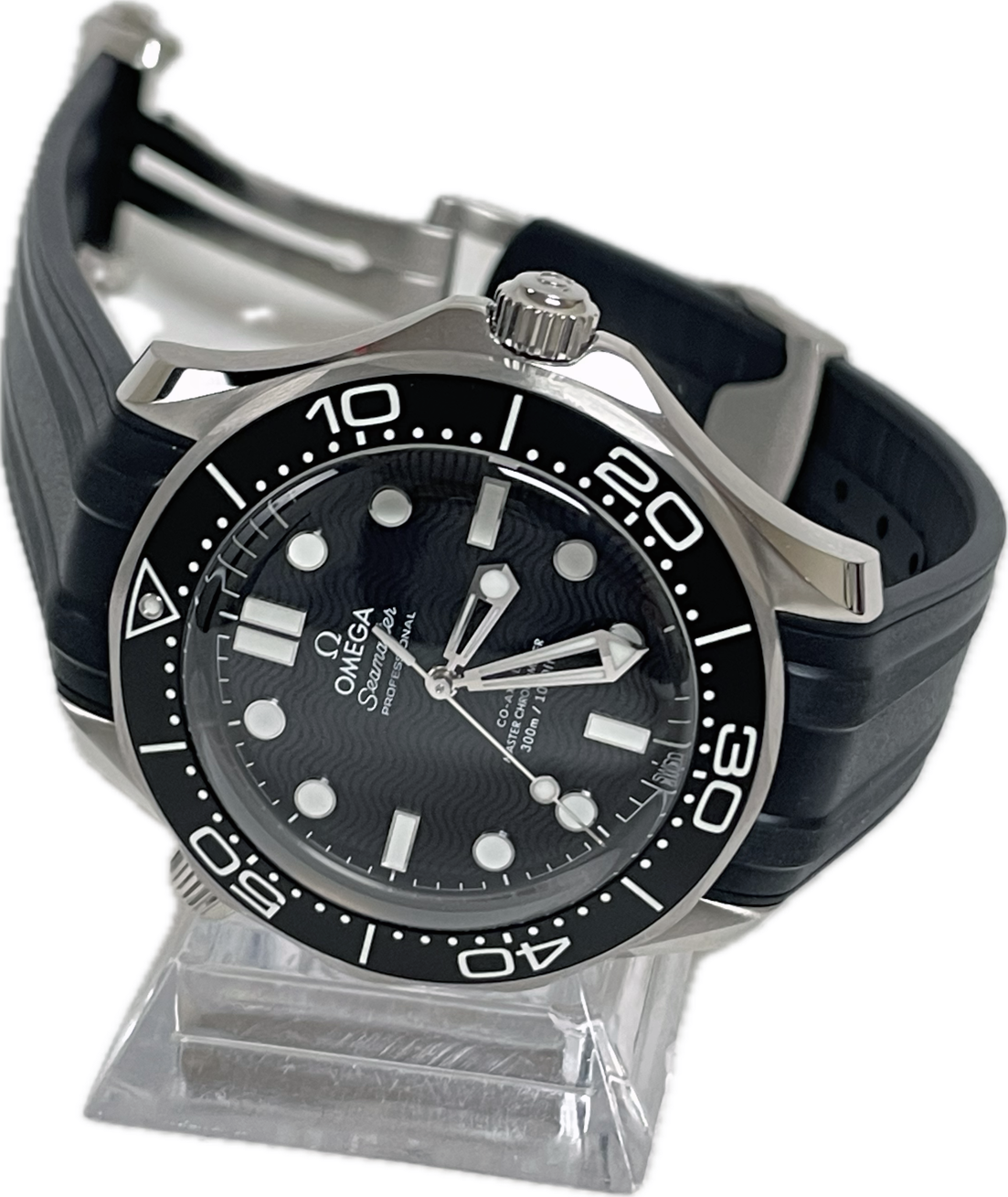 Omega Seamaster Automatic Black Dial Mens Watch 210.32.42.20.01.003. Silver-tone stainless steel case with a black rubber strap. Uni-directional rotating black ceramic bezel. Black dial with rhodium-plated hands and index hour markers. Minute markers around the outer rim. Omega Calibre 8806 automatic movement with a 55-hour power reserve. Scratch resistant sapphire crystal. Screw down crown. Transparent case back. Round case shape. Case size: 42 mm. Band width: 20 mm. Water resistant at 300 meters / 1000 feet.