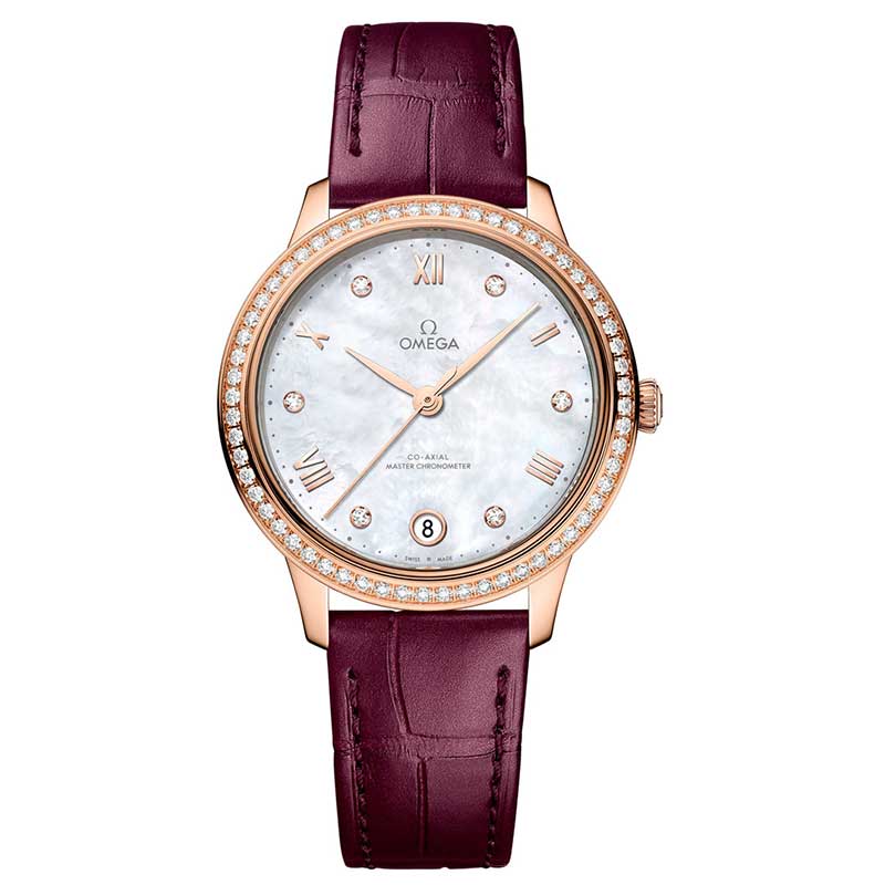 Omega 434.58.34.20.55.002 De Ville Prestige. This exquisite watch features a polished 18kt rose gold case and a bezel set with 60 sparkling diamonds, creating a luxurious aesthetic. The stunning white mother of pearl dial is complemented by polished rose gold-toned hands and alternating diamond and applied polished rose gold hour markers. A fine printed minutes and seconds track enhances functionality, along with a convenient date window at 6 o'clock. Powered by the Omega caliber 8800, which beats at 25,200 vph and contains 35 jewels, this movement offers an impressive power reserve of approximately 55 hours. As a METAS Certified Master-Chronometer, the watch undergoes rigorous testing for water resistance, precision, and magnetic resistance of up to 15,000 gauss. It also features Omega's free-sprung balance, Si14 silicon balance spring, and Co-Axial escapement, with the rotor and visible bridges elegantly finished in a unique arabesque wave design.