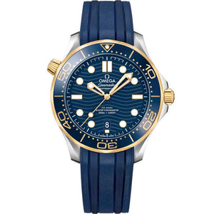Silver-tone stainless steel case with a blue rubber strap. Uni-directional rotating count-up elapsed time 18kt yellow gold with a blue ceramic ring bezel. Blue ceramic (laser-engraved waves) dial with yellow gold-tone skeleton sword-shaped hands and dot hour markers. Minute markers around the outer rim. Dial Type: Analog. Luminescent hands and markers. Date display at the 6 o'clock position. Omega Calibre 8800 Automatic movement, containing 35 Jewels, bitting at 25200 vph, and has a power reserve of approximately 55 hours. Scratch resistant sapphire crystal. Screw down crown. Transparent case back. Round case shape, case size: 42 mm. Band width: 20 mm. Tang clasp. Water resistant at 300 meters / 1000 feet. Functions: date, hour, minute, second, co-axial escapement, chronometer. Seamaster Series. Dive watch style. Watch label: Swiss Made.