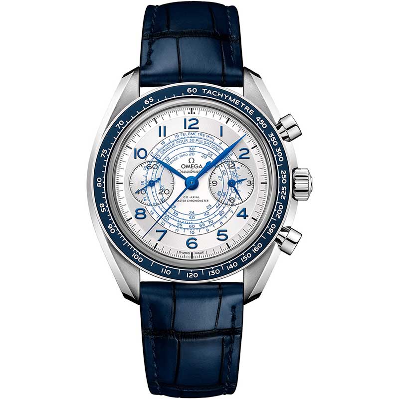 Omega Speedmaster Chronoscope Mens Watch 329.33.43.51.02.001. This Omega watch features a brushed and polished stainless steel case with a blue aluminum bezel and tachymeter scale. The silver dial and sub-dials display finely printed tachymeter, pulsometer, and telemeter scales, blued hands, and applied blued numeral hour markers, along with a minute/seconds track on the perimeter. A small seconds sub-dial sits at 9 o'clock, while the chronograph includes a central seconds hand and a combined minute and hour counter at 3 o'clock. Powered by the Omega manual-winding calibre 9908, this METAS-certified Master Chronometer has a 60-hour power reserve, is anti-magnetic up to 15,000 gauss, and features a rhodium-plated backplate with Geneva wave decoration.