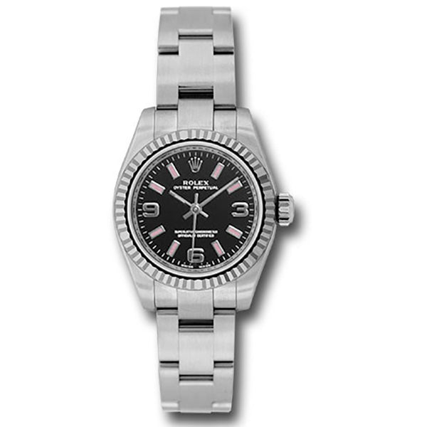 Rolex 176234 bkapio Lady Oyster Perpetual Watch. 26mm brushed stainless steel case, 18kt white gold fluted bezel, black dial, pink index hour markers and Arabic numerals, brushed stainless steel Oyster bracelet.