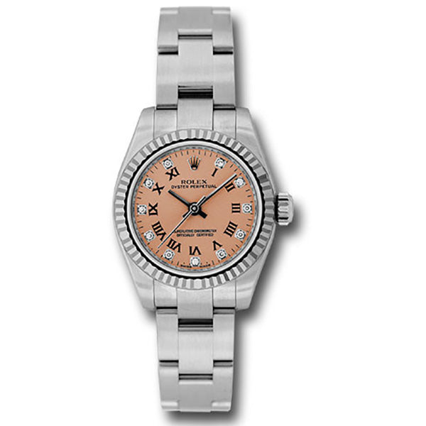 Rolex 176234 pdo Lady Oyster Perpetual Watch. 26mm brushed stainless steel case, 18kt white gold fluted bezel, pink dial, Romand numerals and diamond hour markers, brushed stainless steel Oyster bracelet.