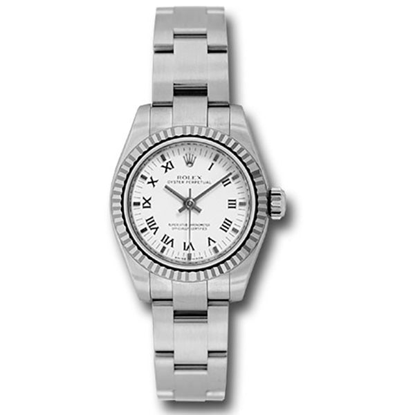 Rolex 176234 wbkro Lady Oyster Perpetual Watch. 26mm brushed stainless steel case, 18kt white gold fluted bezel, white dial, black Roman numerals with index hour markers, brushed stainless steel Oyster bracelet.