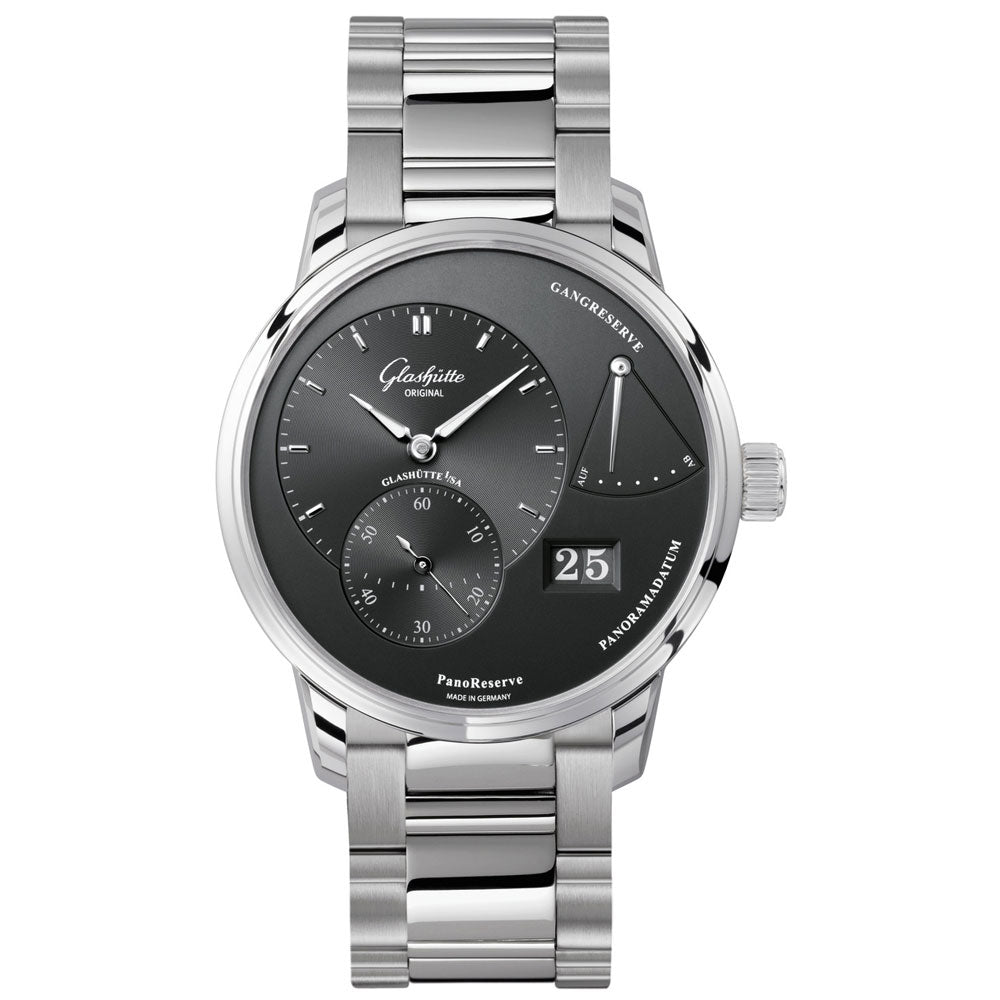 Glashutte PanoReserve Ruthenium Dial Men's Watch 65-01-23-12-24. Stainless steel case with a stainless steel bracelet. Fixed bezel. Ruthenium dial with white gold hands and index hour markers. Calibre 65-01 hand wind movement. Scratch resistant sapphire crystal. Skeleton transparent exhibition see through case back. Case size: 40 mm. Case thickness: 11.7 mm. Round case shape. Fold over with safety clasp. Water resistant at 50 meters / 165 feet. Functions: date, hour, minute, second, power reserve.