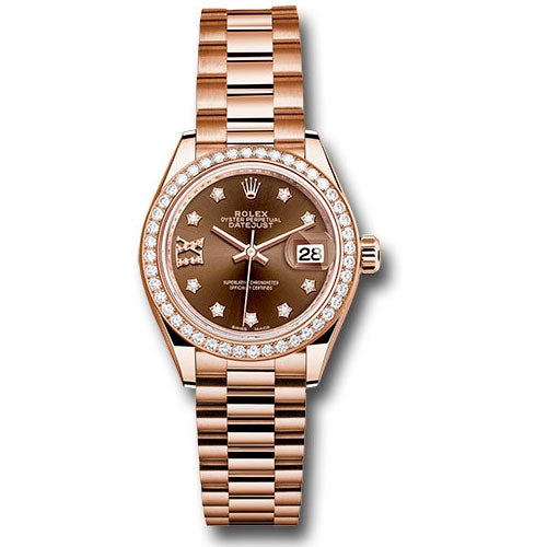Rolex 279135RBR cho9dix8dp Datejust Lady 28 Everose Gold Diamond Bezel President Bracelet. 28mm 18K Everose gold oyster case, screw-down crown with twinlock double waterproofness system, bezel set with 44 diamonds, scratch-resistant sapphire crystal with cyclops lens over the date and double anti-reflective coating, chocolate dial, 9 diamonds set in star shaped hour marker settings and 8 diamond set in Roman numeral IX, Rolex calibre 2236 automatic movement with center hour, minute and seconds hands, instantaneous date with rapid setting, and stop-seconds for precise time setting, 18K Everose gold President bracelet with semi-circular three-piece links, concealed folding Crownclasp buckle. Waterproof to 100 meters.
