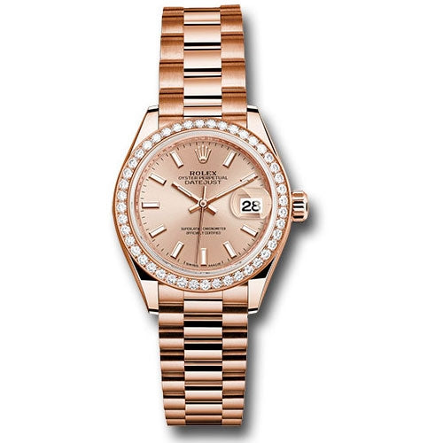 Rolex 279135RBR pip Datejust Lady 28 Everose Gold Diamond Bezel President Bracelet. 28mm 18K Everose gold oyster case, screw-down crown with twinlock double waterproofness system, bezel set with 44 diamonds, scratch-resistant sapphire crystal with cyclops lens over the date and double anti-reflective coating, pink sundust dial, index hour markers with Chromalight, Rolex calibre 2236 automatic movement with center hour, minute and seconds hands, instantaneous date with rapid setting, and stop-seconds for precise time setting, 18K Everose gold President bracelet with semi-circular three-piece links, concealed folding Crownclasp buckle. Waterproof to 100 meters.