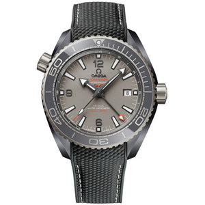 Omega Seamaster Planet Ocean Automatic Mens Watch 215.92.46.22.99.002. The watch features a ceramic case that is brushed and polished, made from silicon nitride ceramic which is two times lighter than traditional ceramic. The crown is titanium with a sandblasted finish, and the case back is a NAIAD LOCK caseback. The uni-directional rotating bezel is polished with a grey silicon nitride ceramic insert and diving scale in Liquidmetal™, with a luminous starting dot. The grey sandblasted dial is made from grade 5 titanium with orange colored accents, and features applied black luminous faceted markers and matte black luminous hands. The dial flange is black, with a central large seconds hand in black with a luminous orange tip. The date window is located at 3 o'clock. Powering the watch is the Omega calibre 8906 Ti, beating at 3Hz/25200 vph with 39 jewels and a power reserve of 60 hours. The watch also includes a GMT Time Zone function indicated by a spear-head hand with a luminous filled tip, pointing to the desired GMT timezone on the dial flange.