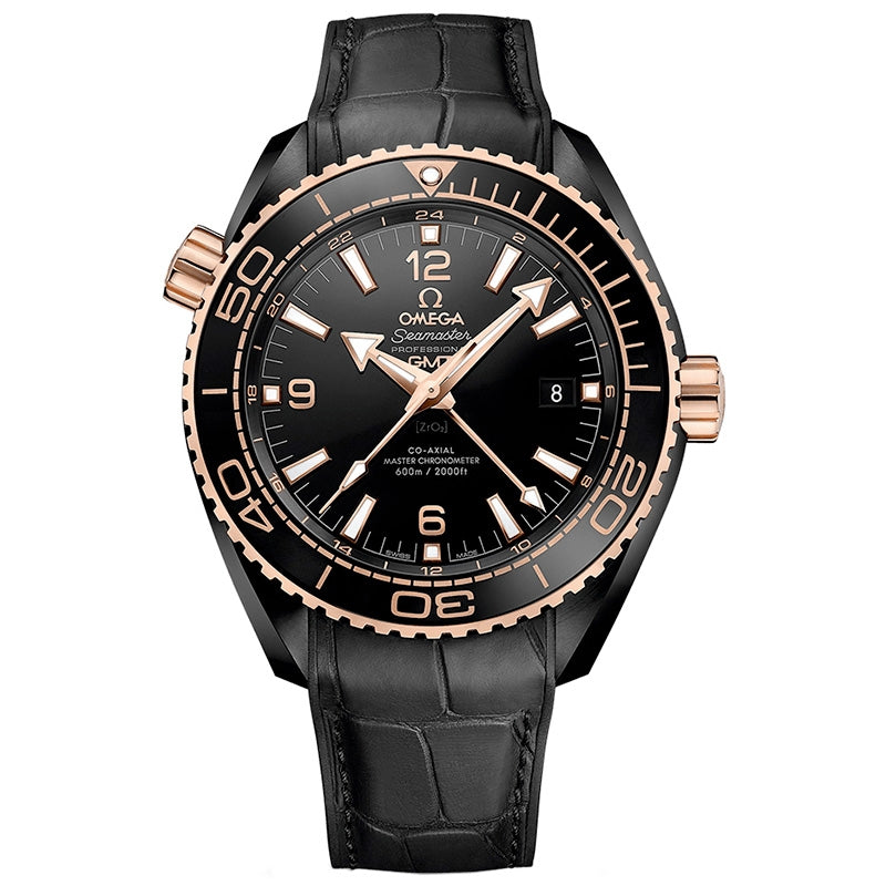 Omega Seamaster Automatic Black Dial Mens Watch 215.63.46.22.01.001. Black ceramic case with a black (alligator) leather strap. Uni-directional rotating 18kt sedna gold bezel with a black ceramic top ring. Black dial with luminous rose gold-tone hands and index hour markers. Arabic numerals mark the 6, 9 and 12 o'clock positions. Minute markers. 24 hour markers around the outer rim. Omega calibre 8906 automatic movement with a 60-hour power reserve. Scratch resistant sapphire crystal. Screw down crown. Transparent case back. Case size: 45.5 mm. Case thickness: 17.60 mm. Round case shape. Band width: 22 mm. Band length: 7 inches. Deployment clasp. Water resistant at 600 meters / 2000 feet.