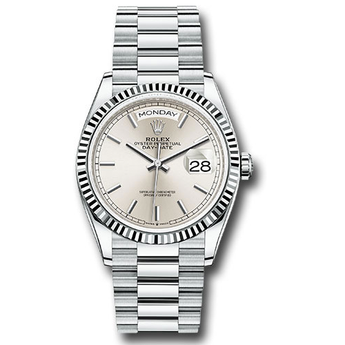 Rolex 128236 sip 36mm platinum case, screw-down back, screw-down crown with twinlock double waterproofness system, fluted bezel, scratch-resistant sapphire crystal with cyclops lens over the date, silver dial, index hour markers, Rolex calibre 3255 perpetual self-winding movement with centre hour, minute and seconds hands, instantaneous day and date in apertures, unrestricted rapid-setting, and stop-seconds for precise time setting, approximately 70 hours of power reserve, President bracelet with semi-circular three-piece links, concealed folding Crownclasp buckle.