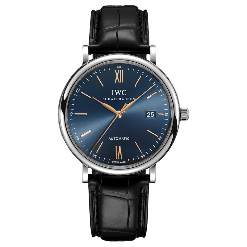 IWC Portofino Automatic Blue Dial Men's Watch IW356523. Stainless steel case with a black crocodile leather strap. Fixed stainless steel bezel. Blue dial with index hour markers. Roman numerals mark the 6 and 12 o'clock positions. minute markers around the outer rim. IWC Calibre 35111 automatic movement with a 42-hour power reserve. Scratch resistant sapphire crystal. Pull / push crown. Solid case back. Round case shape, case size: 40 mm, case thickness: 9.2. Band width: 20 mm, band length: 8 inches. Tang clasp. Water resistant at 30 meters / 100 feet.