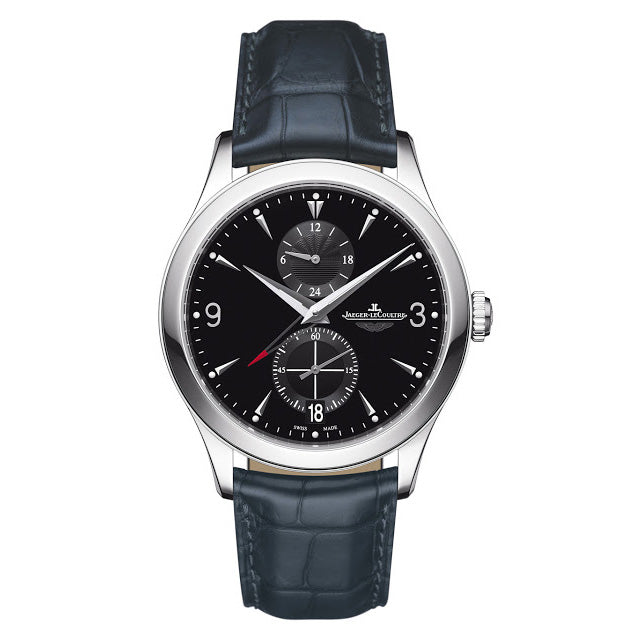 Jaeger LeCoultre Master Hometime Aston Martin Automatic Mens Watch Q162847N. Stainless steel case with a black alligator leather strap. Fixed stainless steel bezel. Black dial with silver-tone hands and stick hour markers. Arabic numerals mark the 3 and 9 o'clock positions. Minute markers around the outer rim. Automatic movement with 48 hour power reserve. Scratch resistant sapphire crystal. Skeleton case back. Case diameter: 40 mm. Round case shape. Deployment clasp with push button. Water resistant at 50 meters / 165 feet. Functions: GMT, second time zone, date, hour, minute, second.
