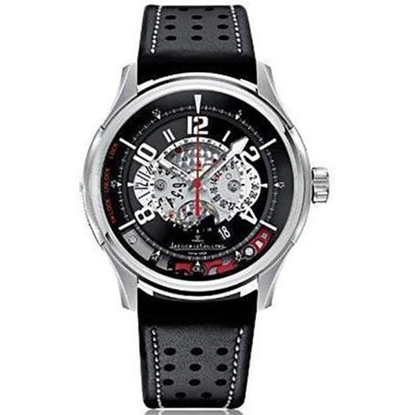 Jaeger-LeCoultre Amvox2 DBS Mens Watch 192T450.or Q192T450 Limited Edition Aston Martin Model. Stainless steel case with a black calfskin leather bracelet with contrast stiching. Fixed titanium bezel. Black dial with luminous hands and Arabic numeral hour markers. Minute markers around the outer rim. Date displays between the 4 and 5 o'clock position. Two subdials displaying a 30 minute counter and a 12- hour counter. Automatic movement. Scratch resistant sapphire crystal. Fluted titanium crown. Engraved case back with with both Jaeger-Lecoultre and Aston Martin logos. Case diameter: 44 mm. Case thickness: 14 mm. Titanium deployment clasp. Water resistant at 50 meters/ 165 feet.