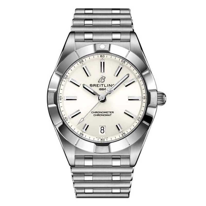 Breitling a77310101a2a1 ladies quartz 32mm watch. The brushed and polished stainless steel case and bracelet of this timepiece give it a sleek and modern look. The white dial is complemented by polished hands and index hour markers with luminous fill, ensuring excellent readability in any lighting conditions. A fine printed minute/seconds track and a date window at 6 o'clock add to the functionality of the watch. Powered by the reliable Breitling caliber 77 SuperQuartz movement, this watch combines style with precision timekeeping for a sophisticated and versatile accessory.