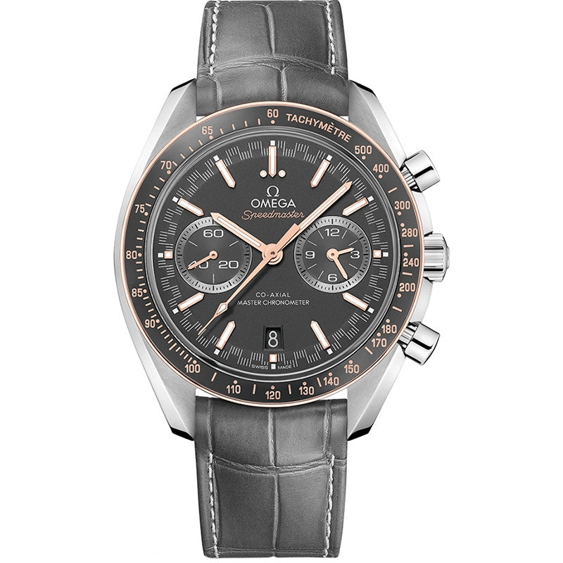 Omega Speedmaster Racing Chronograph Automatic Grey Dial Mens Watch 329.23.44.51.06.001. Stainless steel case with a grey leather strap. Fixed 18kt sedna gold bezel with a black ceramic top ring showing tachymeter markings. Grey dial with luminous 18kt sedna gold hands and index hour markers. Minute markers around the outer rim. Omega calibre 9900 automatic movement with a 60-hour power reserve. Scratch resistant sapphire crystal. Screw down crown. Transparent case back. Round case shape. Case size: 44.25 mm. Band width: 21 mm. Fold over clasp with a push button release. Water resistant at 50 meters / 165 feet.