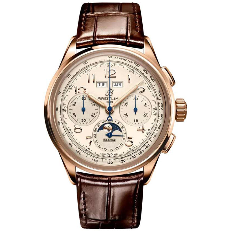 Breitling rb2510371g1p1 Men's Premier Watch. The brushed and polished 18kt rose gold case of this luxurious timepiece is paired with a refined silver and light ivory colored dial, creating an elegant and sophisticated aesthetic. The watch features polished hour and minute hands with luminous fill, as well as blued steel central seconds counter hands and sub-dial hands for a touch of contrast. Applied polished numeral hour markers and a tachymeter scale on the dial flange add to the overall allure. The detailed design includes a fine printed track of minutes, seconds, and fractions of a second, along with a small seconds sub-dial at 9 o'clock. The watch offers practical calendar functions, such as day and month windows at 12 o'clock, a date sub-dial at 6 o'clock, and a moonphase display at the center of the 6 o'clock sub-dial. The chronograph function includes a 60-second large central counter hand and a 30-minute counter sub-dial at 3 o'clock. Powering this extraordinary timepiece is the Breitling in-house caliber B25, operating at 28,800 vph (4Hz), containing 26 jewels, and providing an approximate power reserve of 48 hours.