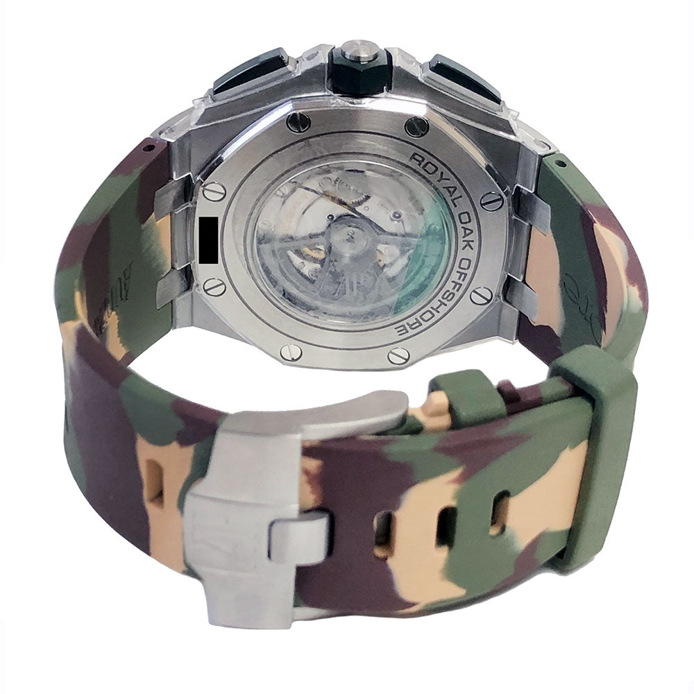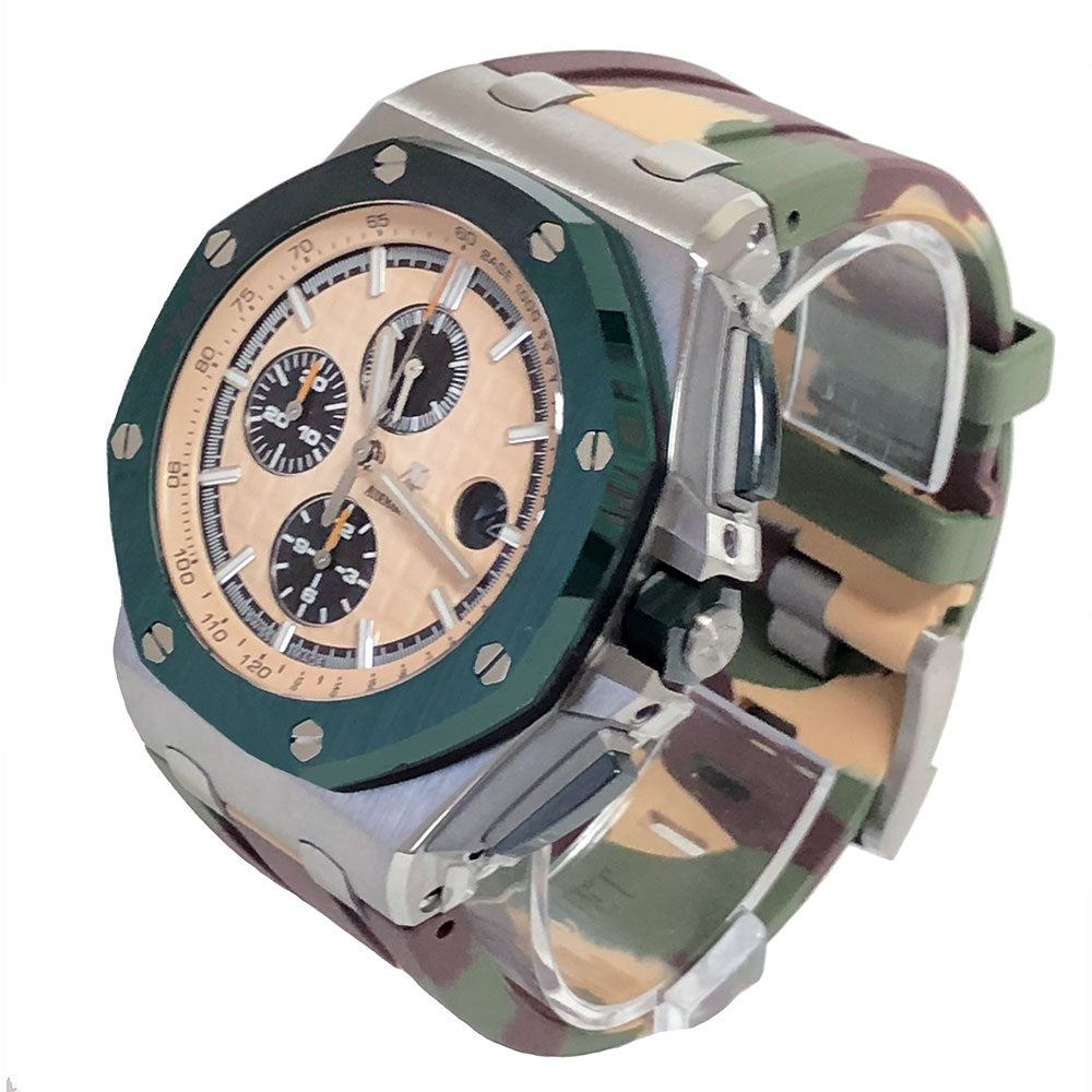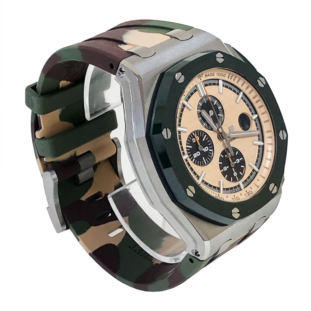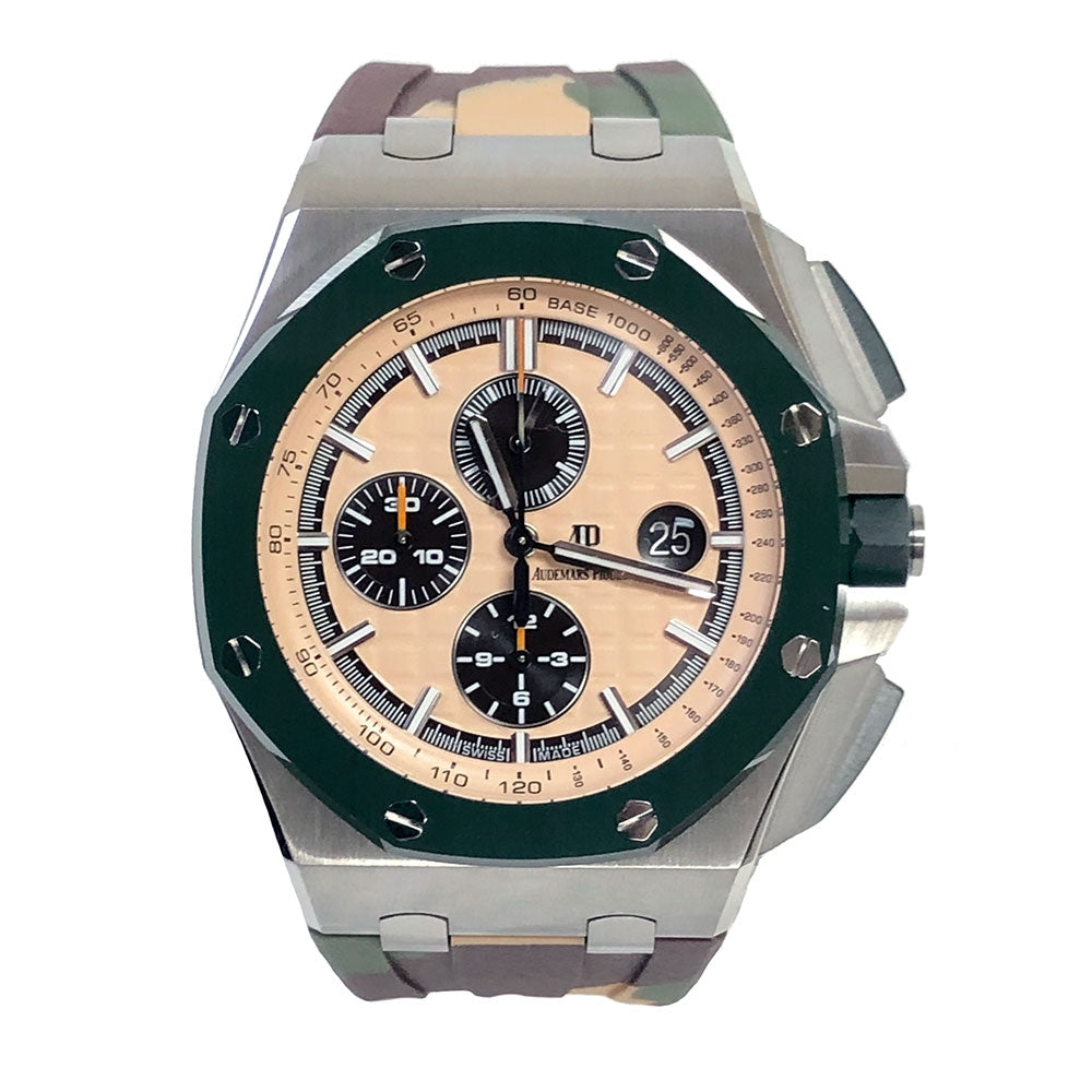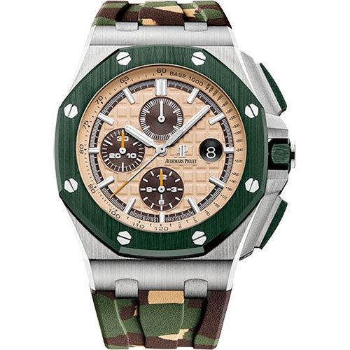 Audemars Piguet Royal Oak Offshore Chronograph Automatic Mens Watch 26400SO.OO.A054CA.01. Stainless steel case with a camouflage rubber strap. Green ceramic bezel. Beige grande tapisserie dial with silver-tone hands and index hour markers. Chronograph - sub-dials displaying: three - 60 second, 30 minute and 12 hours. Audemars Piguet Calibre 3126 / 3840 Manufacture automatic movement with a 50-hour power reserve. Scratch resistant sapphire crystal. Screw down crown. Round case shape, case size: 44 mm, case thickness: 14.4 mm.