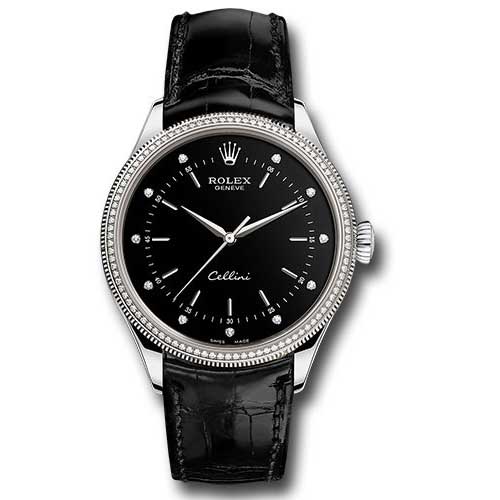 Rolex 50609RBR bkdbk Cellini Time Men's Watch. This exquisite watch features a 39mm 18K white gold case with a flared screw-down crown adorned with the Rolex emblem and a bezel set with 96 sparkling diamonds. The domed sapphire crystal complements the bold black dial, which is accented by 18K white gold diamond-set hour markers. Powered by the Rolex calibre 3132 self-winding movement, it offers approximately 48 hours of power reserve. The watch is elegantly finished with a shiny black alligator leather strap and an 18K white gold buckle, while maintaining a waterproof capability of up to 50 meters.