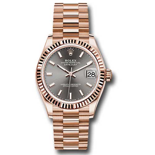 Rolex 278275 dkrhip Datejust 31 Men's Watch. 31mm 18K Everose gold case, screw-down crown with twinlock double waterproofness system, fluted bezel, scratch-resistant sapphire crystal with cyclops lens over the date, dark rhodium dial, index hour markers, Rolex calibre 2236 automatic movement with center hour, minute and seconds hands, instantaneous date with rapid setting, and stop-seconds for precise time setting, approximately 55 hours of power reserve, 18K Everose gold President bracelet with semi-circular three-piece links, concealed folding Crownclasp buckle. Waterproof to 100 meters.