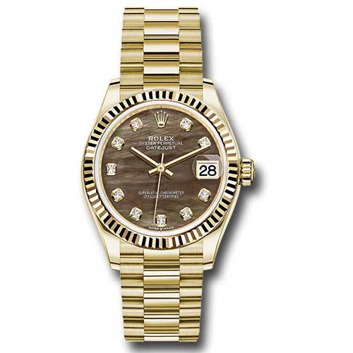 Rolex 278278 dkmdp Oyster Perpetual Datejust Ladies Watch. 31mm 18kt yellow gold case, screw-down crown with twinlock double waterproofness system, fluted bezel, scratch-resistant sapphire crystal with cyclops lens over the date, dark mother of pearl dial, diamond hour markers, Rolex calibre 2236 automatic movement with center hour, minute and seconds hands, instantaneous date with rapid setting, and stop-seconds for precise time setting, approximately 55 hours of power reserve, 18K yellow gold President bracelet with semi-circular three-piece links, concealed folding Crownclasp buckle. Waterproof to 100 meters.