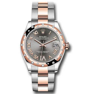 This stunning watch features a 31mm Everose Rolesor case, expertly crafted from a combination of Oystersteel and 18K Everose gold. It is designed with a screw-down back and a screw-down crown that incorporates the Twinlock double waterproofness system for enhanced durability. The 18K Everose gold domed bezel is elegantly set with 24 diamonds, adding a luxurious touch to its overall design. A scratch-resistant sapphire crystal protects the striking dark rhodium dial, which is adorned with Roman numerals and features a diamond at the 6 o'clock position for an extra touch of elegance.