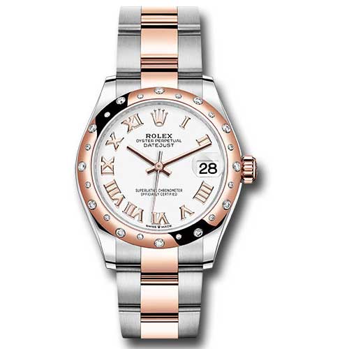 Rolex 278341RBR wro Perpetual Datejust Watch. This luxurious watch features a 31mm Everose Rolesor case, expertly constructed from a combination of Oystersteel and 18K Everose gold. It includes a screw-down back and a screw-down crown equipped with the Twinlock double waterproofness system, ensuring exceptional durability. The elegant 18K Everose gold domed bezel is beautifully set with 24 diamonds, while the scratch-resistant sapphire crystal incorporates a cyclops lens over the date display. The watch showcases a pristine white dial adorned with Roman numerals, contributing to its classic charm. Powered by the Rolex Calibre 2236 perpetual self-winding movement, this timepiece features a date function at 3 o'clock and offers approximately 55 hours of power reserve. The Everose Rolesor Oyster bracelet is crafted from a blend of steel and 18K Everose gold, featuring flat three-piece links and secured by a folding Oysterclasp buckle with an Easylink 5mm comfort extension link for easy adjustments. With a waterproof rating of up to 100 meters, this exquisite watch beautifully merges elegance and functionality, making it suitable for any occasion.