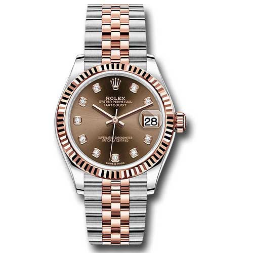 Rolex 278271 chodj Oyster Perpetual Datejust Watch. This stunning watch features a 31mm Everose Rolesor case, meticulously crafted from a combination of Oystersteel and 18K Everose gold. It includes a screw-down back and a screw-down crown that utilizes the Twinlock double waterproofness system for enhanced durability. The elegant 18K Everose gold fluted bezel surrounds a rich chocolate dial, which is adorned with diamond hour markers, adding a luxurious touch to its design. Protected by a scratch-resistant sapphire crystal with a cyclops lens over the date display at 3 o'clock, the watch is powered by the Rolex Calibre 2236 perpetual self-winding movement, offering approximately 55 hours of power reserve. The Everose Rolesor Jubilee bracelet, featuring semi-circular three-piece links, is secured with a concealed folding Crownclasp buckle for a seamless fit. With a waterproof rating of up to 100 meters, this exquisite timepiece beautifully combines elegance and functionality, making it suitable for any occasion.