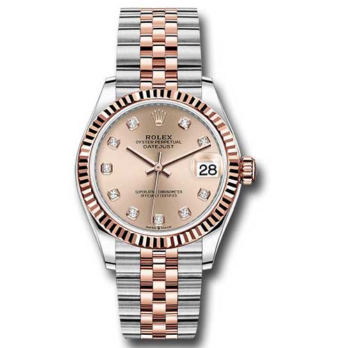 Rolex 278271 rodj Oyster Perpetual Datejust Watch. This elegant watch features a 31mm Everose Rolesor case made from Oystersteel and 18K Everose gold, equipped with a screw-down back and crown that utilize the Twinlock double waterproofness system. It showcases an 18K Everose gold fluted bezel, a scratch-resistant sapphire crystal with a cyclops lens for the date, and a beautiful rosé dial adorned with diamond hour markers. Powered by the Rolex Calibre 2236 perpetual self-winding movement, it offers a date function at 3 o'clock and approximately 55 hours of power reserve. The Everose Rolesor Jubilee bracelet, with semi-circular three-piece links and a concealed folding Crownclasp buckle, adds sophistication, and the watch is waterproof up to 100 meters.