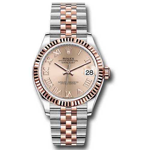 Rolex 278271 rorj Oyster Perpetual Datejust Watch. This sophisticated watch features a 31mm Everose Rolesor case made from Oystersteel and 18K Everose gold, complete with a screw-down back and a screw-down crown that utilizes the Twinlock double waterproofness system. It showcases an 18K Everose gold fluted bezel, a scratch-resistant sapphire crystal with a cyclops lens over the date, and an attractive rosé dial adorned with Roman numerals. Powered by the Rolex Calibre 2236 perpetual self-winding movement, it includes a date function at 3 o'clock and approximately 55 hours of power reserve. The Everose Rolesor Jubilee bracelet, featuring semi-circular three-piece links and a concealed folding Crownclasp buckle, adds elegance, while the watch is waterproof up to 100 meters.