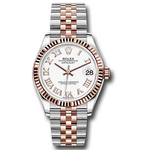 Rolex 278271 wrj Oyster Perpetual Datejust Watch. This sophisticated watch features a 31mm Everose Rolesor case made from Oystersteel and 18K Everose gold, complete with a screw-down back and a screw-down crown that utilizes the Twinlock double waterproofness system. The elegant 18K Everose gold fluted bezel frames a crisp white dial adorned with Roman numerals and is protected by a scratch-resistant sapphire crystal with a cyclops lens over the date at 3 o'clock. Powered by the Rolex Calibre 2236 perpetual self-winding movement, it offers approximately 55 hours of power reserve. The watch is finished with an Everose Rolesor Jubilee bracelet featuring semi-circular three-piece links and a concealed folding Crownclasp buckle, and it is waterproof up to 100 meters.