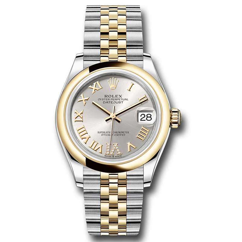 Rolex 278243 sdr6j Oyster Perpetual Datejust Watch. 31mm yellow Rolesor case comprised of Oystersteel and 18K yellow gold, screw-down back, screw-down crown with twinlock double waterproofness system, 18K yellow gold domed bezel, scratch-resistant sapphire crystal with cyclops lens over the date, silver dial,Roman numerals with 11 diamonds at VI, Rolex calibre 2236 perpetual self-winding movement with date at 3 o'clock, approximately 55 hours of power reserve, yellow Rolesor Jubilee bracelet with semi-circular three-piece links, concealed folding Crownclasp buckle. Waterproof to 100 meters. Baselworld 2019 release.