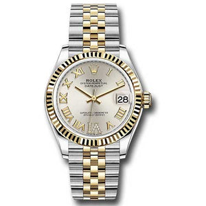 Rolex 278273 sdr6j Oyster Perpetual Datejust Watch. 31mm yellow Rolesor case comprised of Oystersteel and 18K yellow gold, screw-down back, screw-down crown with twinlock double waterproofness system, 18K yellow gold fluted bezel, scratch-resistant sapphire crystal with cyclops lens over the date, silver dial, Roman numerals with 11 diamonds on VI. Rolex calibre 2236 perpetual self-winding movement with date at 3 o'clock, approximately 55 hours of power reserve, yellow Rolesor Jubilee bracelet with semi-circular three-piece links, concealed folding Crownclasp buckle. Waterproof to 100 meters. Baselworld 2019 release.