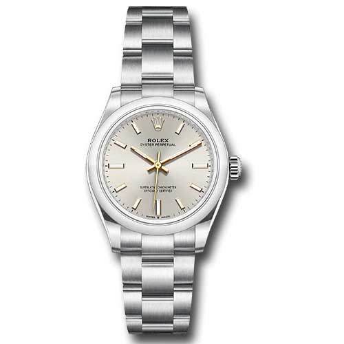 Rolex 277200 sio Oyster Perpetual Datejust Ladies Watch. This elegant watch features a 31mm Oystersteel case, designed for both durability and style. It includes a screw-down crown with a Twinlock double waterproofness system, ensuring robust water resistance. The domed bezel elegantly frames a scratch-resistant sapphire crystal that protects the charming silver dial, which is accented by index hour markers. Powered by the Rolex calibre 2232 automatic movement, this timepiece offers center hour, minute, and seconds hands, along with a stop-seconds function for precise timekeeping. With an impressive power reserve of approximately 55 hours, it is complemented by an Oyster bracelet with flat three-piece links and a folding Oysterclasp buckle featuring an Easylink 5mm comfort extension link. This watch is also waterproof up to 100 meters, making it a stylish yet practical choice for everyday wear.