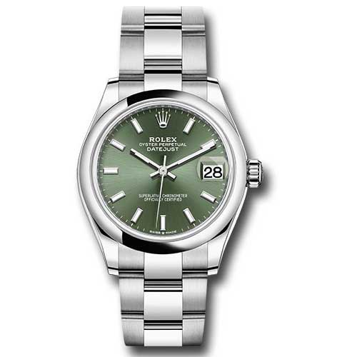 Rolex Datejust Oyster Bracelet Unisex Watch 278240 mgio. This sophisticated watch showcases a 31mm Oystersteel case, featuring a screw-down back and a screw-down crown that includes the Twinlock double waterproofness system for exceptional durability. The domed bezel is complemented by a scratch-resistant sapphire crystal, which features a cyclops lens strategically placed over the date display at 3 o'clock. The mint green dial is elegantly adorned with index hour markers, enhancing its classic appeal. Inside, the watch is powered by the Rolex Calibre 2236 perpetual self-winding movement, offering an approximate power reserve of 55 hours. The Oystersteel Oyster bracelet, designed with flat three-piece links and a concealed folding Oysterclasp buckle, provides both comfort and style. With a waterproof rating of up to 100 meters, this timepiece is a perfect blend of elegance and functionality, making it suitable for any occasion.
