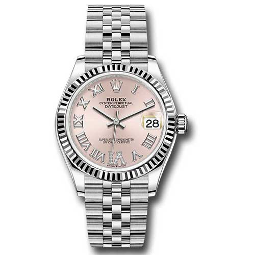 Rolex Datejust Pink Diamond Dial Jubilee Bracelet 18k White Gold Fluted Bezel Unisex Watch 278274 pdr6j. This captivating watch features a 31mm white Rolesor case crafted from a blend of Oystersteel and 18K white gold, designed with a screw-down back and a screw-down crown that incorporates the Twinlock double waterproofness system for enhanced reliability. The elegant 18K white gold fluted bezel encircles a beautiful pink dial, which is adorned with Roman numerals and a diamond set at the 6 o'clock position. It is protected by a scratch-resistant sapphire crystal with a cyclops lens over the date display at 3 o'clock. Powered by the Rolex Calibre 2236 perpetual self-winding movement, this timepiece offers approximately 55 hours of power reserve. The watch is completed with an Oystersteel Jubilee bracelet featuring five-piece links and a concealed folding Crownclasp buckle, and it is waterproof up to 100 meters, making it a perfect fusion of style and functionality.