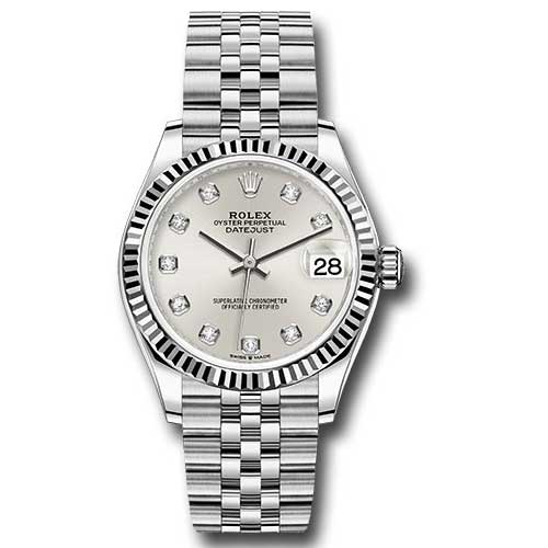 Rolex 278274 sdj Datejust Mid-Size Steel Ladies Watch. 31mm white Rolesor case comprised of Oystersteel and 18K white gold, screw-down back, screw-down crown with twinlock double waterproofness system, 18K white gold fluted bezel, scratch-resistant sapphire crystal with cyclops lens over the date, silver dial, diamond hour markers, Rolex calibre 2236 perpetual self-winding movement with date at 3 o'clock, approximately 55 hours of power reserve, Oystersteel Jubilee bracelet with five-piece links, concealed folding Crownclasp buckle. Waterproof to 100 meters.