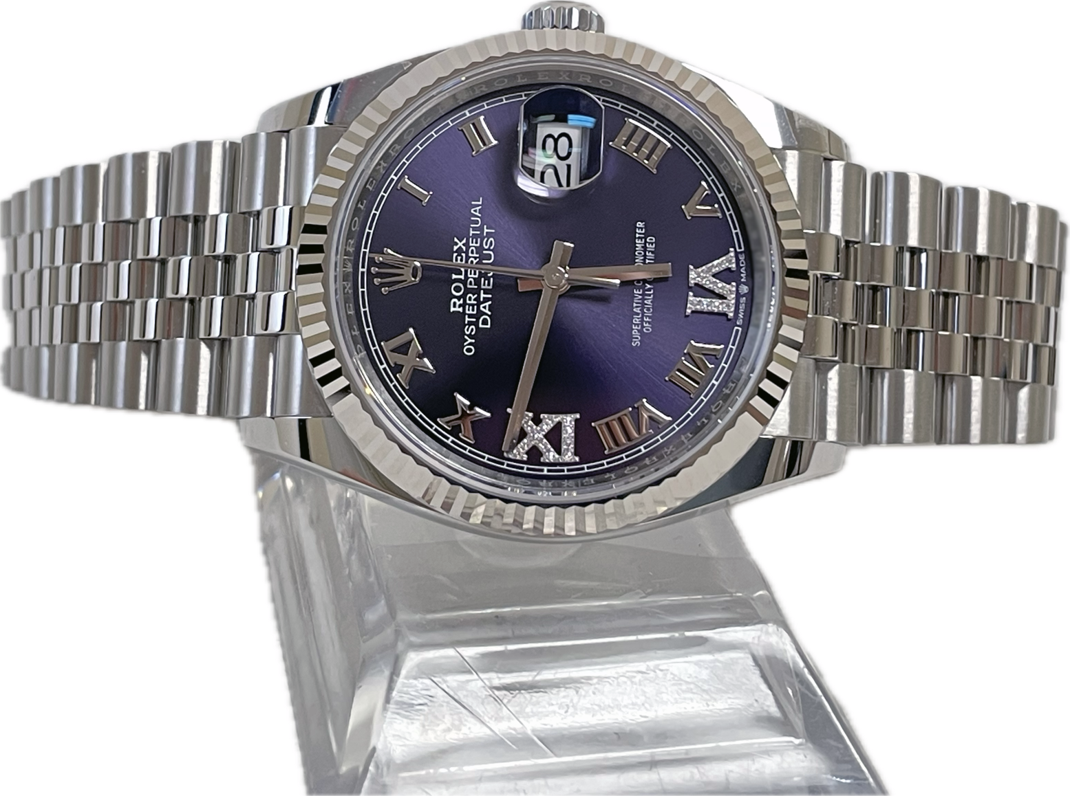 Rolex 126234 audr69j Datejust Steel and White Gold Men's Watch. 36mm Oystersteel case, screw-down steel back, screw-down crown with twinlock double waterproofness system, fluted bezel, scratch-resistant sapphire crystal with cyclops lens over the date, aubergine dial, Roman numerals with diamond set 6 and 9, Rolex calibre 3235 perpetual self-winding movement with center hour, minute and seconds hands, instantaneous date at 3 o'clock with rapid setting, and stop-seconds for precise time setting, approximately 70 hours of power reserve, Oyster bracelet with five-piece links, folding Oysterclasp buckle with Easylink 5mm comfort extension link. Waterproof to 100 meters.