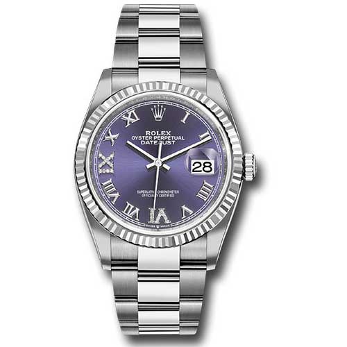 Rolex 126234 audr69o Datejust 36mm Black Dial Oyster Bracelet Men's Watch. 36mm Oystersteel case, screw-down steel back, screw-down crown with twinlock double waterproofness system, fluted bezel, scratch-resistant sapphire crystal with cyclops lens over the date, aubergine dial, Roman numerals with diamond set 6 and 9, Rolex calibre 3235 perpetual self-winding movement with center hour, minute and seconds hands, instantaneous date at 3 o'clock with rapid setting, and stop-seconds for precise time setting, approximately 70 hours of power reserve, Jubilee bracelet with five-piece links, folding Oysterclasp buckle with Easylink 5mm comfort extension link. Waterproof to 100 meters. Baselworld 2019 release.