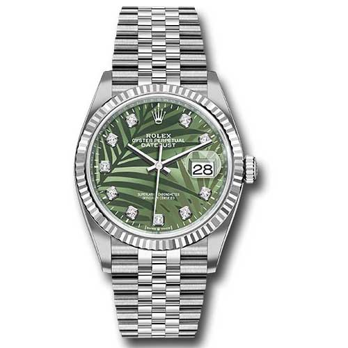 Rolex 126234 ogpmdj Datejust Steel and White Gold Men's Watch. 36mm Oystersteel case, screw-down steel back, screw-down crown with twinlock double waterproofness system, fluted bezel, scratch-resistant sapphire crystal with cyclops lens over the date, olive green palm motif dial, diamond hour markers, Rolex calibre 3235 perpetual self-winding movement with center hour, minute and seconds hands, instantaneous date at 3 o'clock with rapid setting, and stop-seconds for precise time setting, approximately 70 hours of power reserve, Oyster bracelet with five-piece links, folding Oysterclasp buckle with Easylink 5mm comfort extension link. Waterproof to 100 meters.