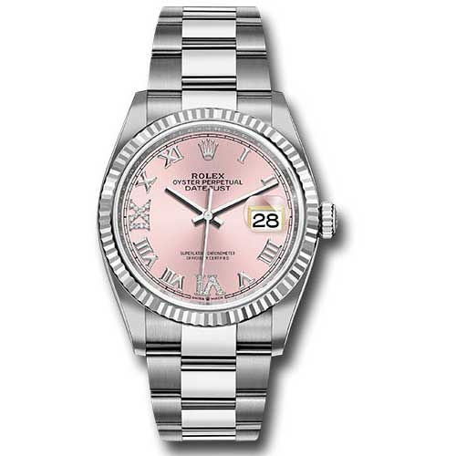 Rolex 126234 pdr69o Datejust 36mm Black Dial Oyster Bracelet Men's Watch. 36mm Oystersteel case, screw-down steel back, screw-down crown with twinlock double waterproofness system, fluted bezel, scratch-resistant sapphire crystal with cyclops lens over the date, pink dial, Roman numerals with diamond set 6 and 9, Rolex calibre 3235 perpetual self-winding movement with center hour, minute and seconds hands, instantaneous date at 3 o'clock with rapid setting, and stop-seconds for precise time setting, approximately 70 hours of power reserve, Jubilee bracelet with five-piece links, folding Oysterclasp buckle with Easylink 5mm comfort extension link. Waterproof to 100 meters. Baselworld 2019 release.