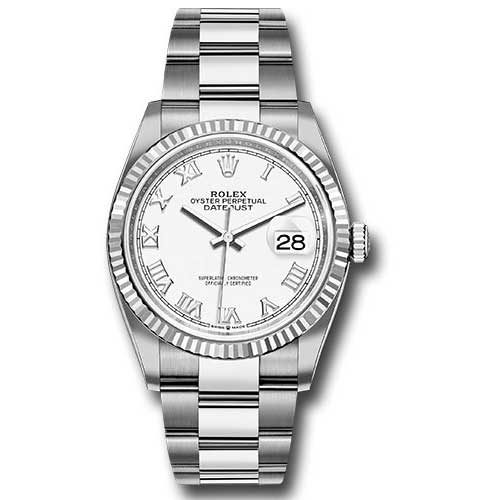 Rolex 126234 wro Datejust 36mm Black Dial Oyster Bracelet Men's Watch. 36mm Oystersteel case, screw-down steel back, screw-down crown with twinlock double waterproofness system, fluted bezel, scratch-resistant sapphire crystal with cyclops lens over the date, white dial, Roman numerals, Rolex calibre 3235 perpetual self-winding movement with center hour, minute and seconds hands, instantaneous date at 3 o'clock with rapid setting, and stop-seconds for precise time setting, approximately 70 hours of power reserve, Oyster bracelet with five-piece links, folding Oysterclasp buckle with Easylink 5mm comfort extension link. Waterproof to 100 meters. Baselworld 2019 release.