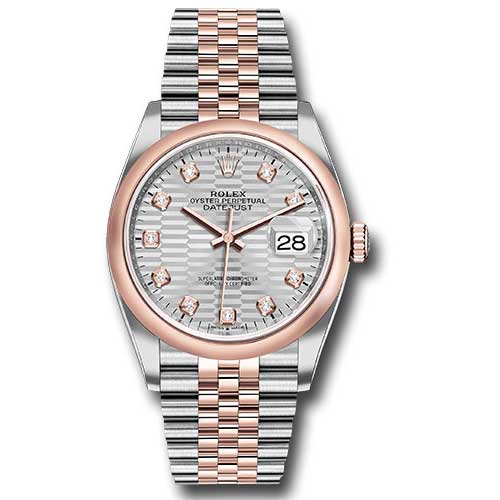 Rolex 126201 sflmdj Oyster Perpetual Datejust 36 Watch. 36mm Everose Rolesor case with Oystersteel monobloc middle case, screw-down steel back, screw-down 18K Everose crown, 18K Everose domed bezel, silver fluted motif dial, 10 diamond hour markers, Rolex calibre 3235 self-winding movement with date at 3 o'clock, approximately 70 hours of power reserve, Everose Rolesor Jubilee bracelet with five-piece links, folding Oysterclasp buckle with Easylink 5mm comfort extension link. Waterproof to 100 meters. Redesigned for Baselworld 2018 with updated case sides, lugs, and calibre 3235 movement.