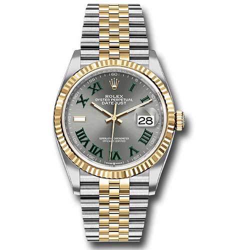 Rolex 126233 slgrj Oyster Perpetual Datejust 36 Watch. 36mm yellow Rolesor case with Oystersteel monobloc middle case, screw-down steel back, screw-down 18K yellow crown, 18K yellow fluted bezel, slate dial, green Roman numerals, Rolex calibre 3235 self-winding movement with date at 3 o'clock, approximately 70 hours of power reserve, yellow Rolesor Jubilee bracelet with five-piece links, folding Oysterclasp buckle with Easylink 5mm comfort extension link. Waterproof to 100 meters. Redesigned for Baselworld 2018 with updated case sides, lugs, and calibre 3235 movement.