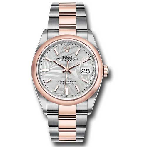 Rolex 126201 spmio 36mm Everose Rolesor case with Oystersteel monobloc middle case, screw-down steel back, screw-down 18K Everose crown, 18K Everose domed bezel, silver palm motif dial, index hour markers, Rolex calibre 3235 self-winding movement with date at 3 o'clock, approximately 70 hours of power reserve, Everose Rolesor Oyster bracelet with flat three-piece links, folding Oysterclasp buckle with Easylink 5mm comfort extension link. Waterproof to 100 meters. Redesigned for Baselworld 2018 with updated case sides, lugs, and calibre 3235 movement.