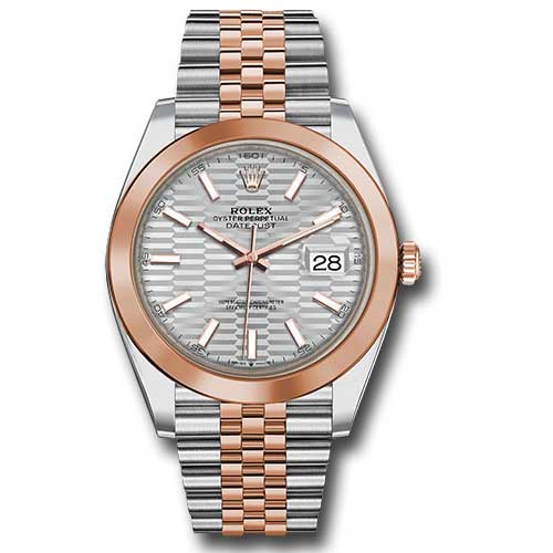 Rolex 126301 sflmij Oyster Perpetual Datejust 41 Men's Watch. 41mm Everose Rolesor case with 904L steel monobloc middle case, screw-down steel back, 18K Everose gold screw-down crown, 18K Everose gold smooth bezel, scratch-resistant double anti-reflective sapphire crystal with cyclops lens over the date, silver fluted motif dial, index hour markers, Rolex calibre 3235 perpetual self-winding movement with date at 3 o'clock that changes instantaneously at midnight in a few thousandths of a second, approximately 70 hours of power reserve, Everose Rolesor Jubilee bracelet made from a combination of 904L steel and 18K Everose gold with five-piece links, folding Oysterclasp buckle with Easylink 5mm comfort extension link. Waterproof to 100 meters.