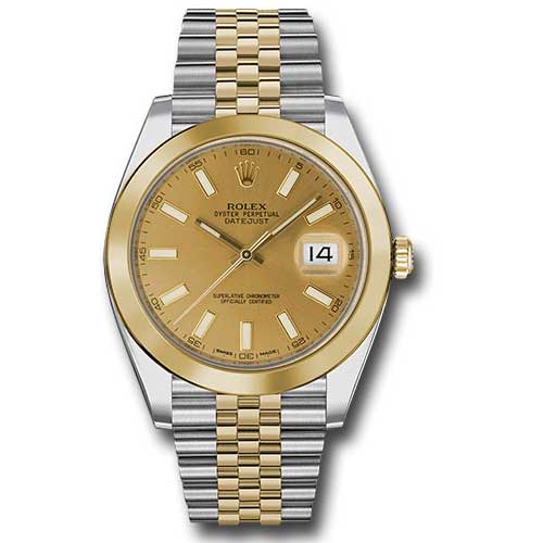 Rolex 126303 chij Oyster Perpetual Datejust 41 Watch. 41mm Yellow Rolesor case with 904L steel monobloc middle case, screw-down steel back, 18K yellow gold screw-down crown, 18K yellow gold smooth bezel, scratch-resistant double anti-reflective sapphire crystal with cyclops lens over the date, champagne dial, index hour markers, Rolex calibre 3235 perpetual self-winding movement with date at 3 o'clock that changes instantaneously at midnight in a few thousandths of a second, approximately 70 hours of power reserve, yellow Rolesor Jubilee bracelet made from a combination of 904L steel and 18K yellow gold with five-piece links, folding Oysterclasp buckle with Easylink 5mm comfort extension link. Waterproof to 100 meters.