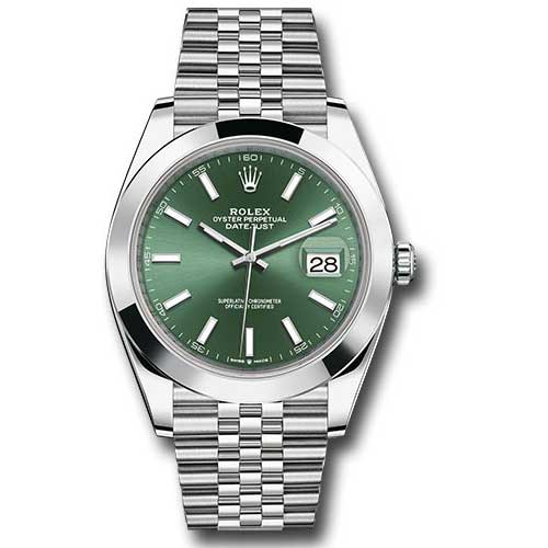 Rolex 126300 mgij Perpetual Datejust 41mm Men's Watch. 904L stainless steel case, screw-down steel back, screw-down crown with twinlock double waterproofness system, smooth bezel, scratch-resistant double anti-reflective sapphire crystal with cyclops lens over the date, mint green dial, index hour markers, Rolex calibre 3235 perpetual self-winding movement with date at 3 o'clock that changes instantaneously at midnight in a few thousandths of a second, approximately 70 hours of power reserve, 904L steel Jubilee bracelet with five-piece links, folding Oysterclasp buckle with Easylink 5mm comfort extension link. Waterproof to 100 meters.