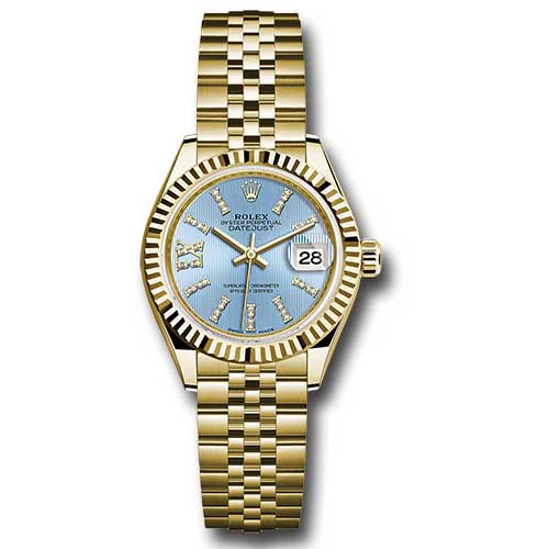 Rolex 279178 cbls36dix8dj Ladies Watch. This luxurious watch features a 28mm 18K yellow gold Oyster case equipped with a screw-down crown that utilizes the Twinlock double waterproofness system and a classic fluted bezel. It boasts a scratch-resistant sapphire crystal with a cyclops lens over the date and a double anti-reflective coating, showcasing a striking cornflower blue stripe dial adorned with 36 diamonds set in index hour markers and eight diamonds at the Roman numeral IX. Powered by the Rolex calibre 2236 automatic movement, it includes center hour, minute, and seconds hands along with an instantaneous date feature that allows for rapid setting and stop-seconds for precise time adjustment. The elegant 18K yellow gold Jubilee bracelet, featuring five-piece links and a concealed folding Crownclasp buckle, reinforces its sophisticated design, while the watch is waterproof up to 100 meters.